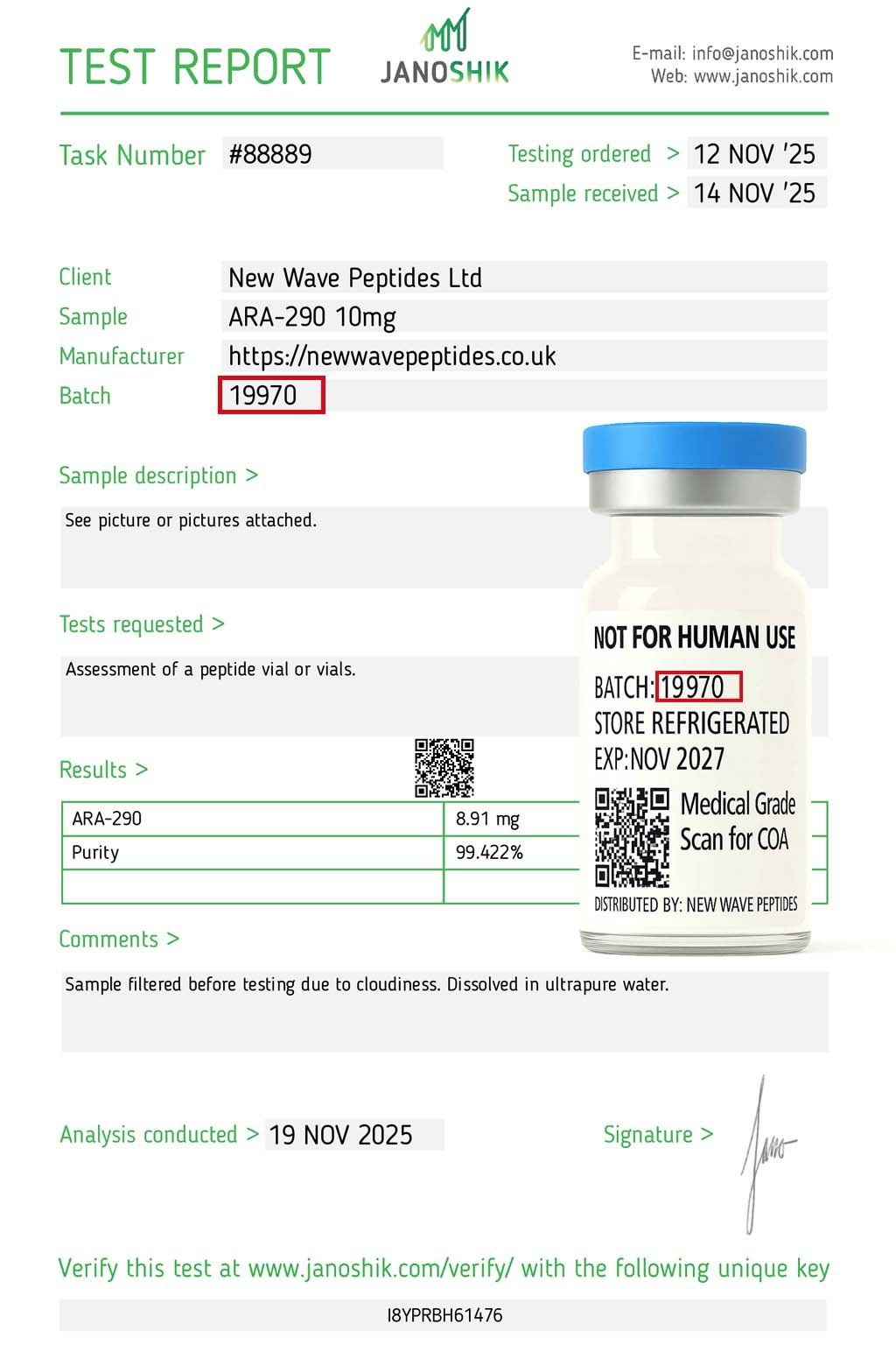 At New Wave Peptides, our ARA-290 is a high-purity research-grade peptide widely studied for its potential roles in inflammation modulation, tissue protection, neural recovery, and immune pathway signalling. ARA-290 (also known as Cibinetide) is a synthetic pyroglutamate peptide designed for research into pathways involving the innate repair receptor (IRR). This product is intended strictly for laboratory-based studies in controlled research environments.