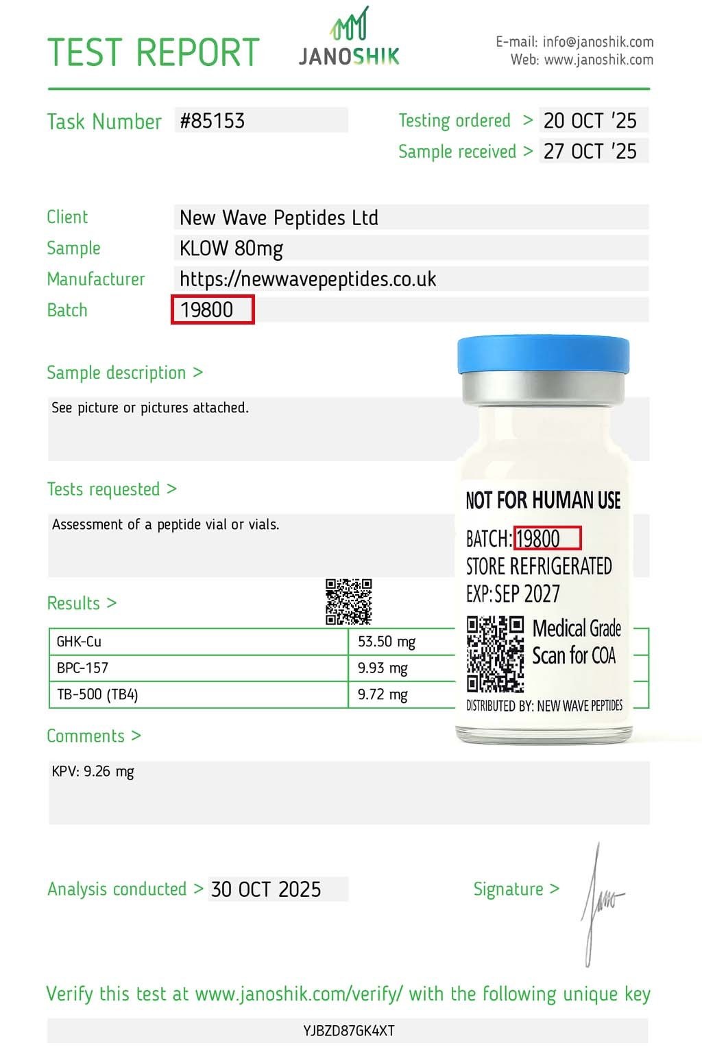 Batch 19800 is independently tested by Janoshik to confirm >99% purity for all components. Each vial is labelled for full transparency and traceability.