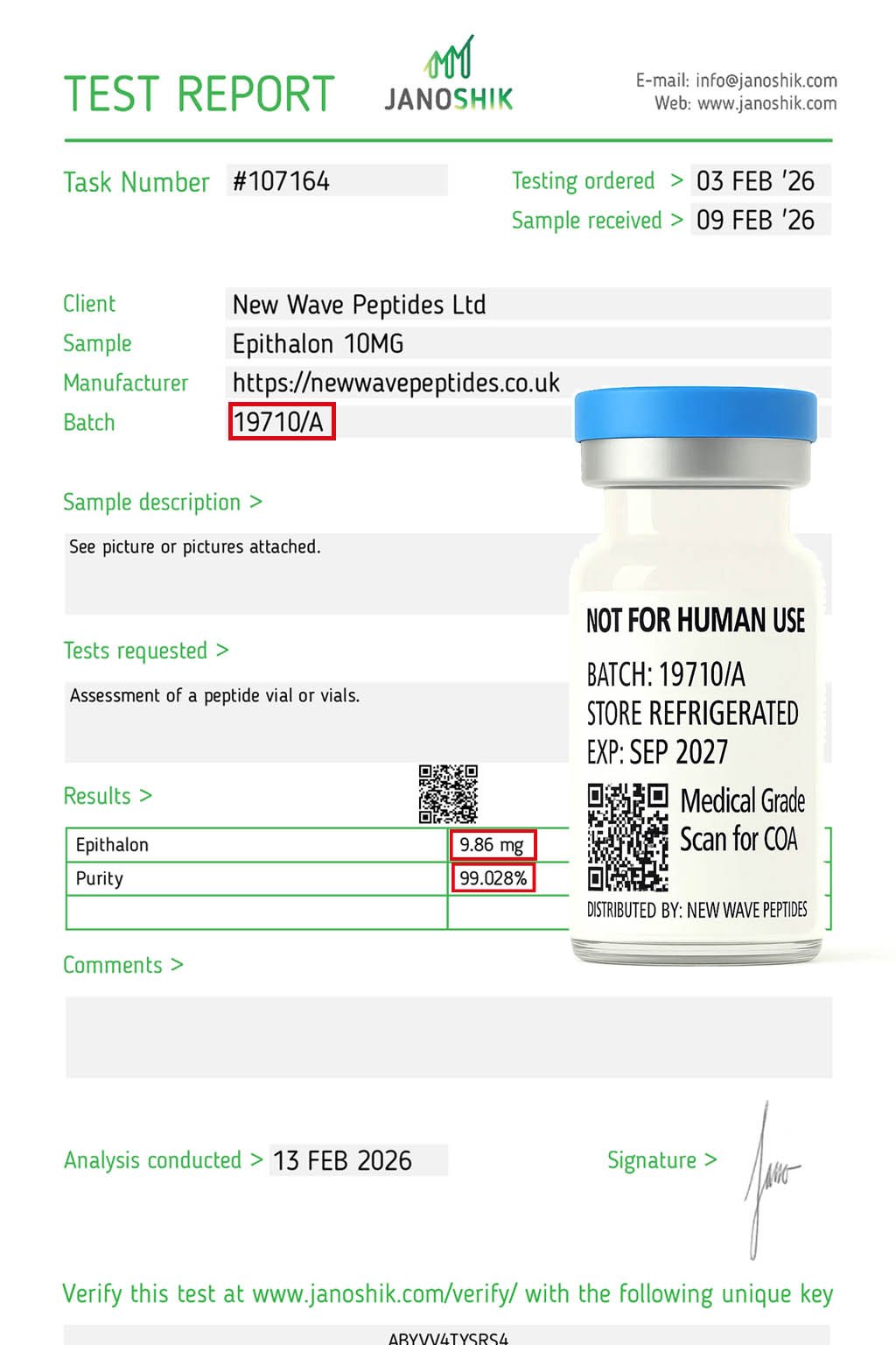 Each batch is independently verified by Janoshik, a leading peptide analysis lab. Every production run is tested for purity and consistency, and the batch number printed on the vial directly matches its Certificate of Analysis (COA) for full traceability.