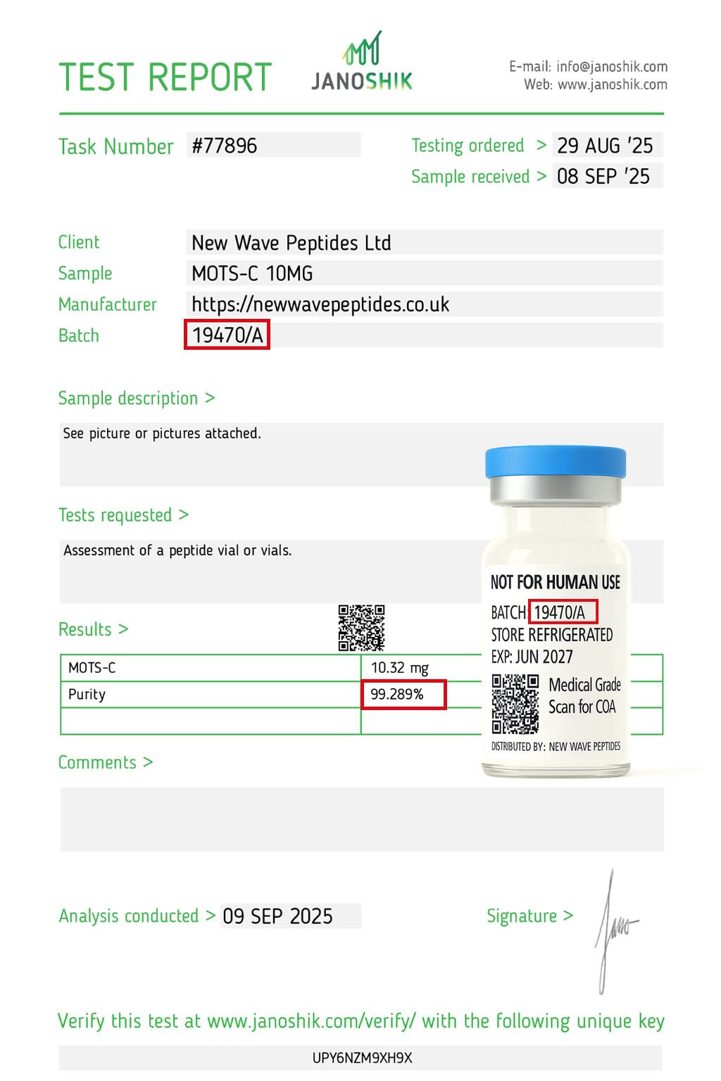 MOTS-c (Mitochondrial Open Reading Frame of the 12S rRNA-c) is a mitochondrial-derived peptide studied for its potential role in regulating metabolism, insulin sensitivity, and cellular stress response. At New Wave Peptides, we supply MOTS-c in high-purity, research-grade form for use in scientific and laboratory settings only.