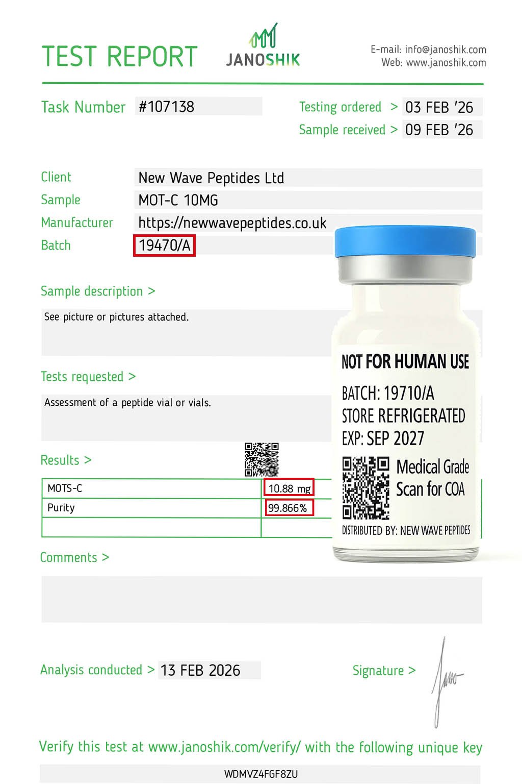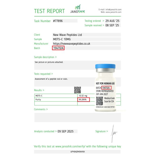 This batch (19470) has been independently verified by Janoshik to ensure 99%+ purity and consistency. Each vial is clearly labelled for full traceability.