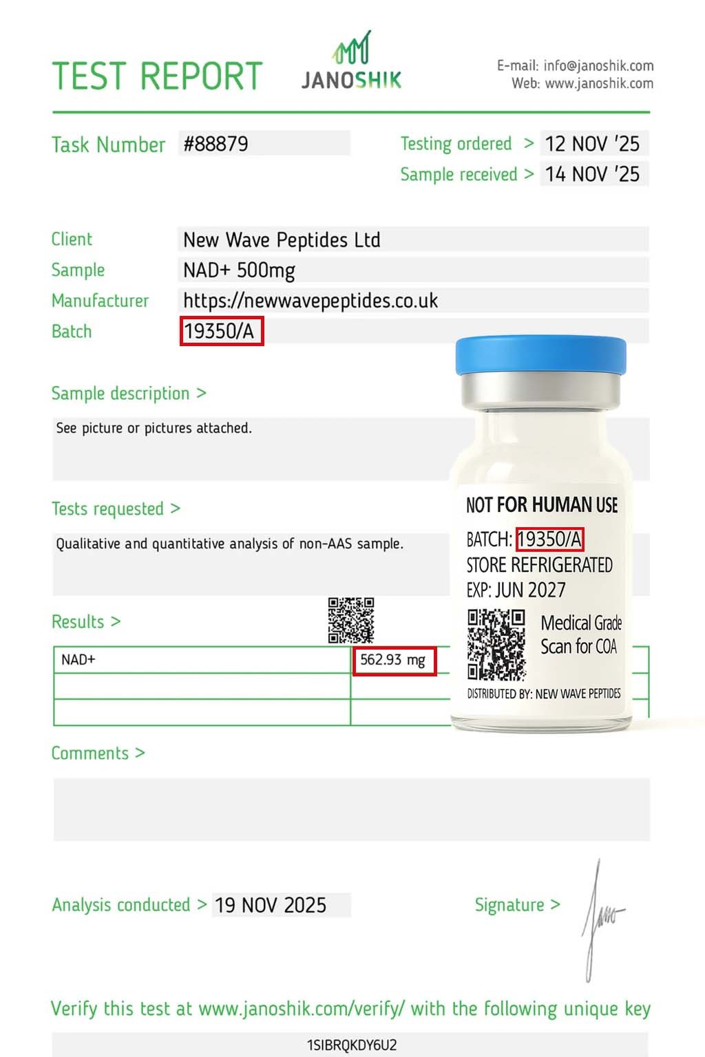 Each batch is independently tested by Janoshik, a trusted name in peptide and compound analysis. We test every new batch to ensure consistency and quality. The batch number is clearly printed on each vial and matches the corresponding Certificate of Analysis (COA) for full traceability and transparency.