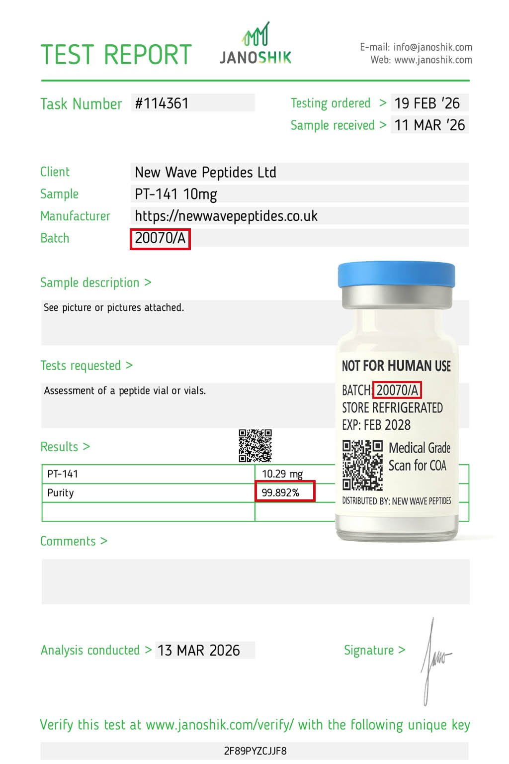 This batch (20070/A) is independently tested by Janoshik and confirmed to exceed 99% purity. Each vial is batch-labelled for traceability and consistent research standards.