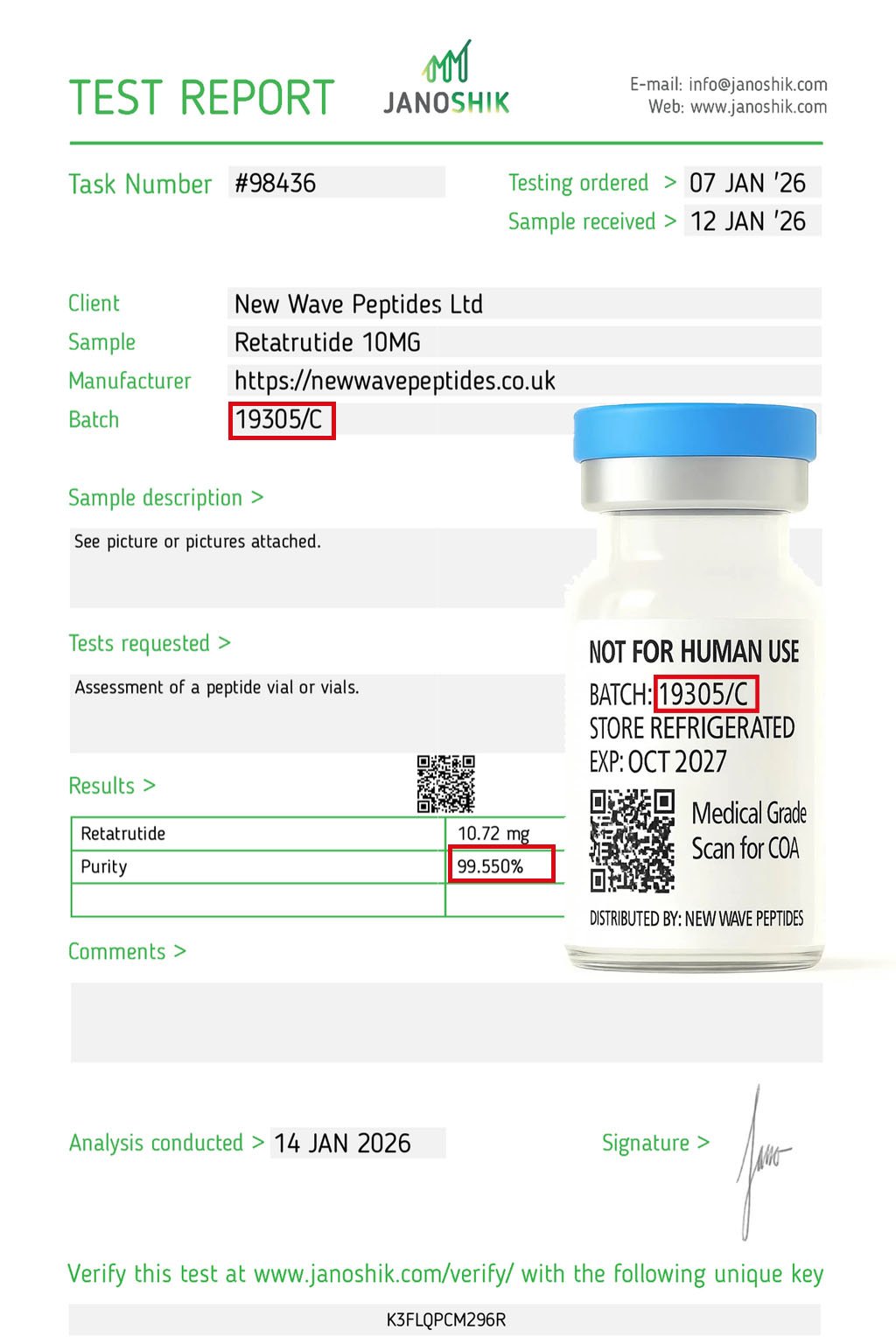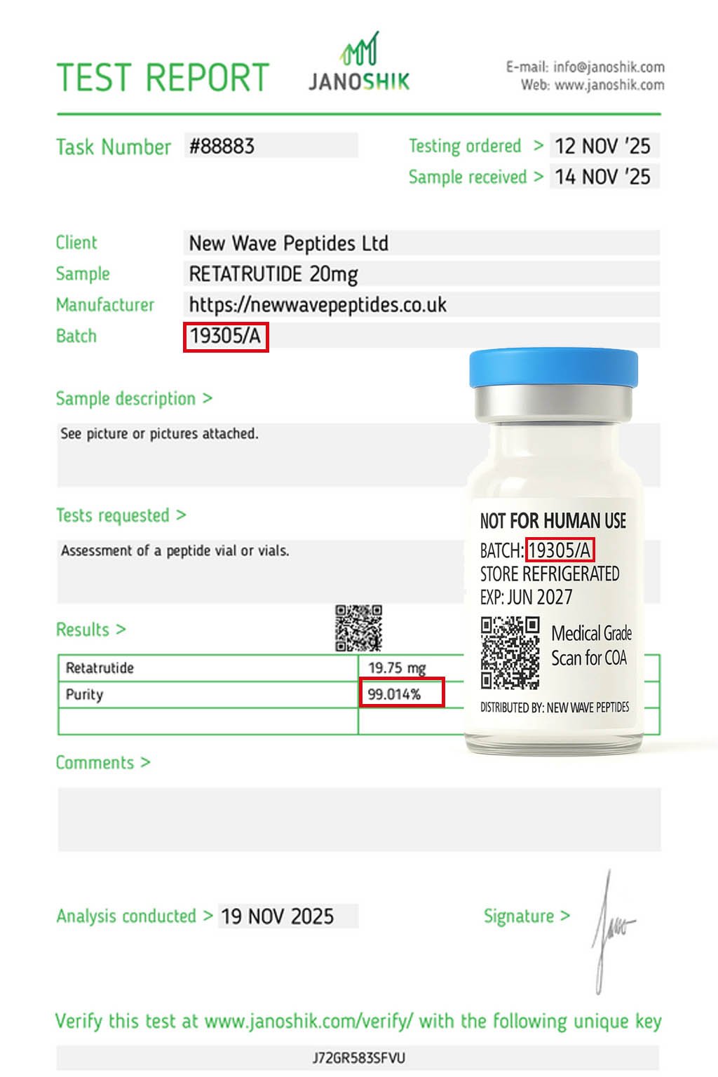 Each batch is independently tested by Janoshik, a trusted name in peptide analysis. We test every new batch to ensure consistency and quality. The batch number is clearly printed on each vial and matches the corresponding Certificate of Analysis (COA) for full traceability and transparency.