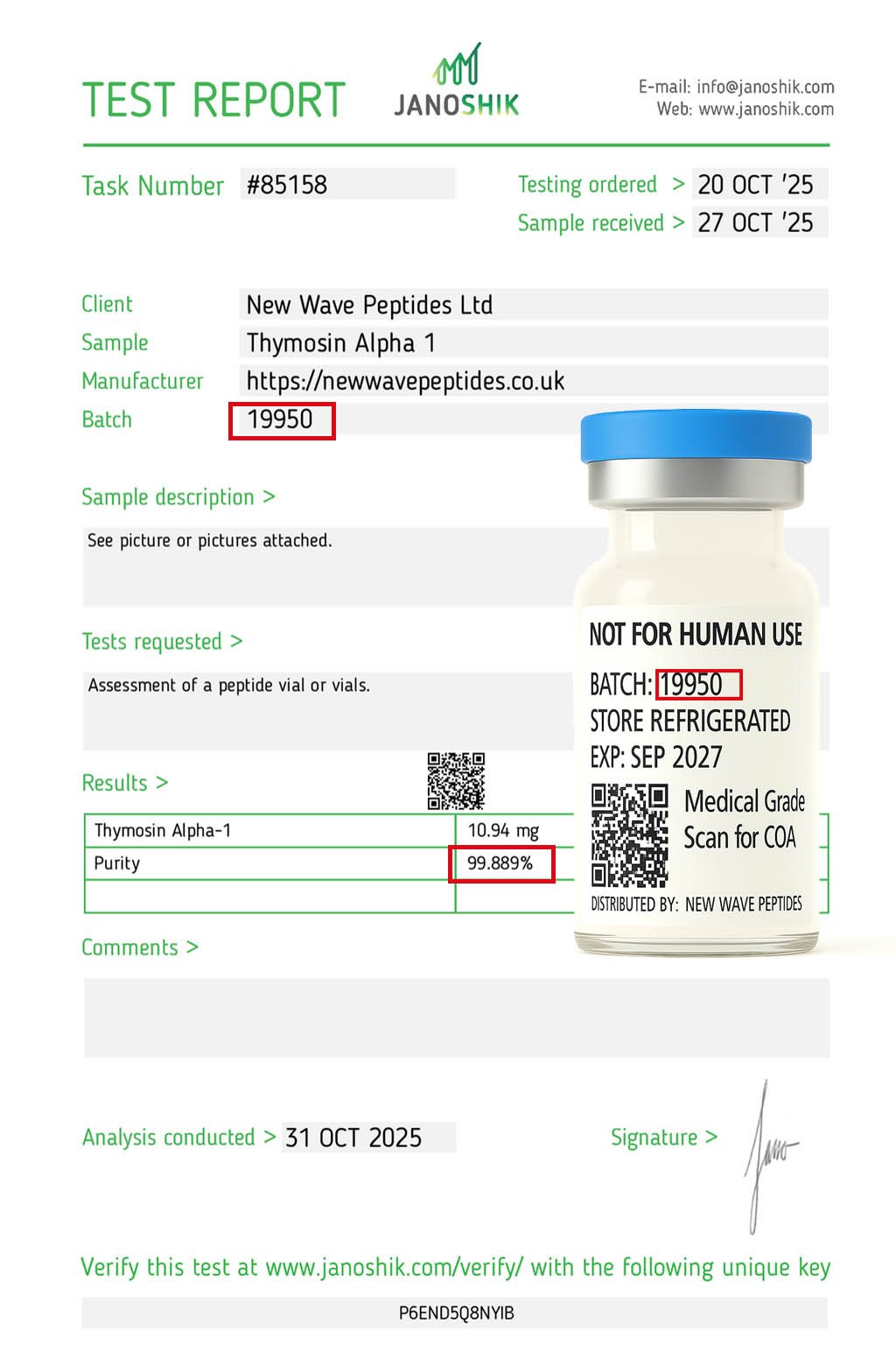 This batch (19950) is independently tested by Janoshik and confirmed to exceed 99% purity. Each vial is batch-labelled for traceability and consistent research standards.
